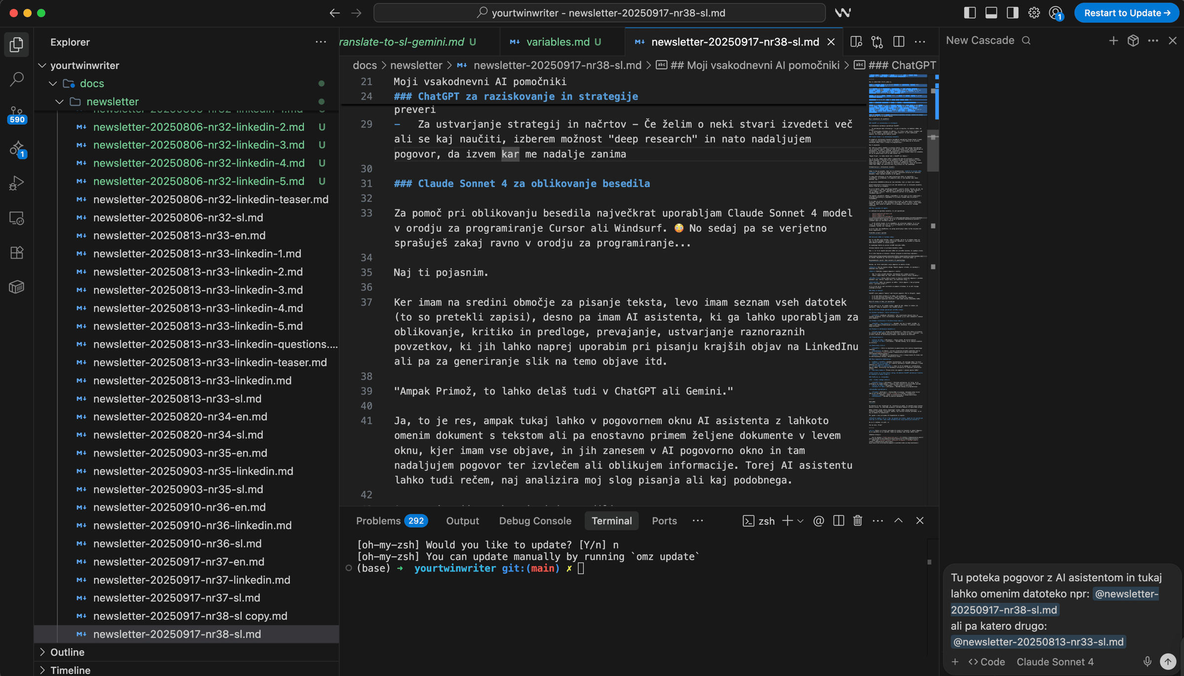 Za pomoč pri oblikovanju besedila največkrat uporabljam Claude Sonnet 4 model v orodju za programiranje Cursor ali Windsurf. 😳 No sedaj pa se verjetno sprašuješ zakaj ravno v orodju za programiranje…